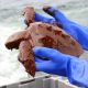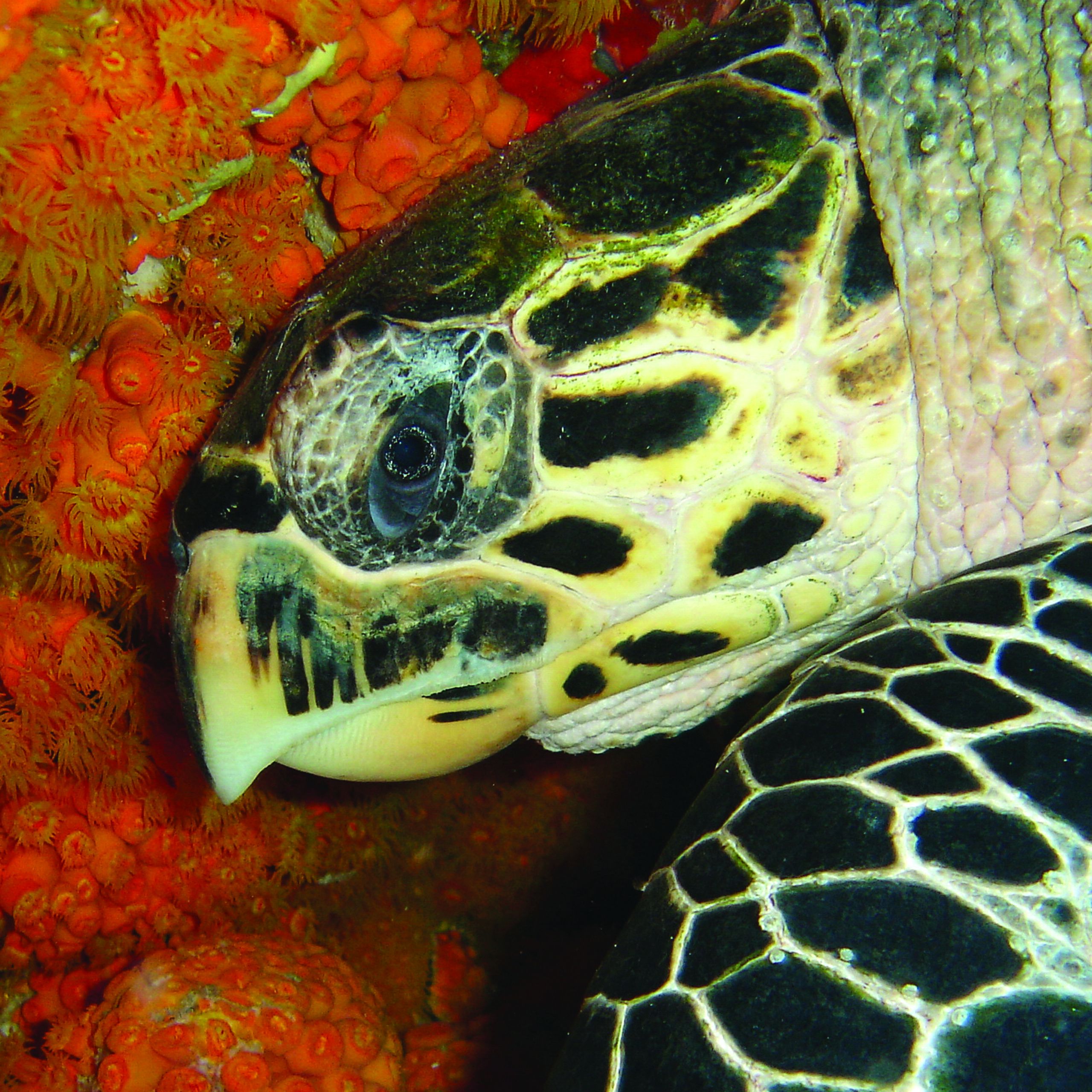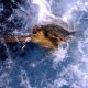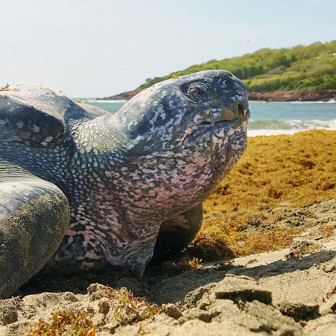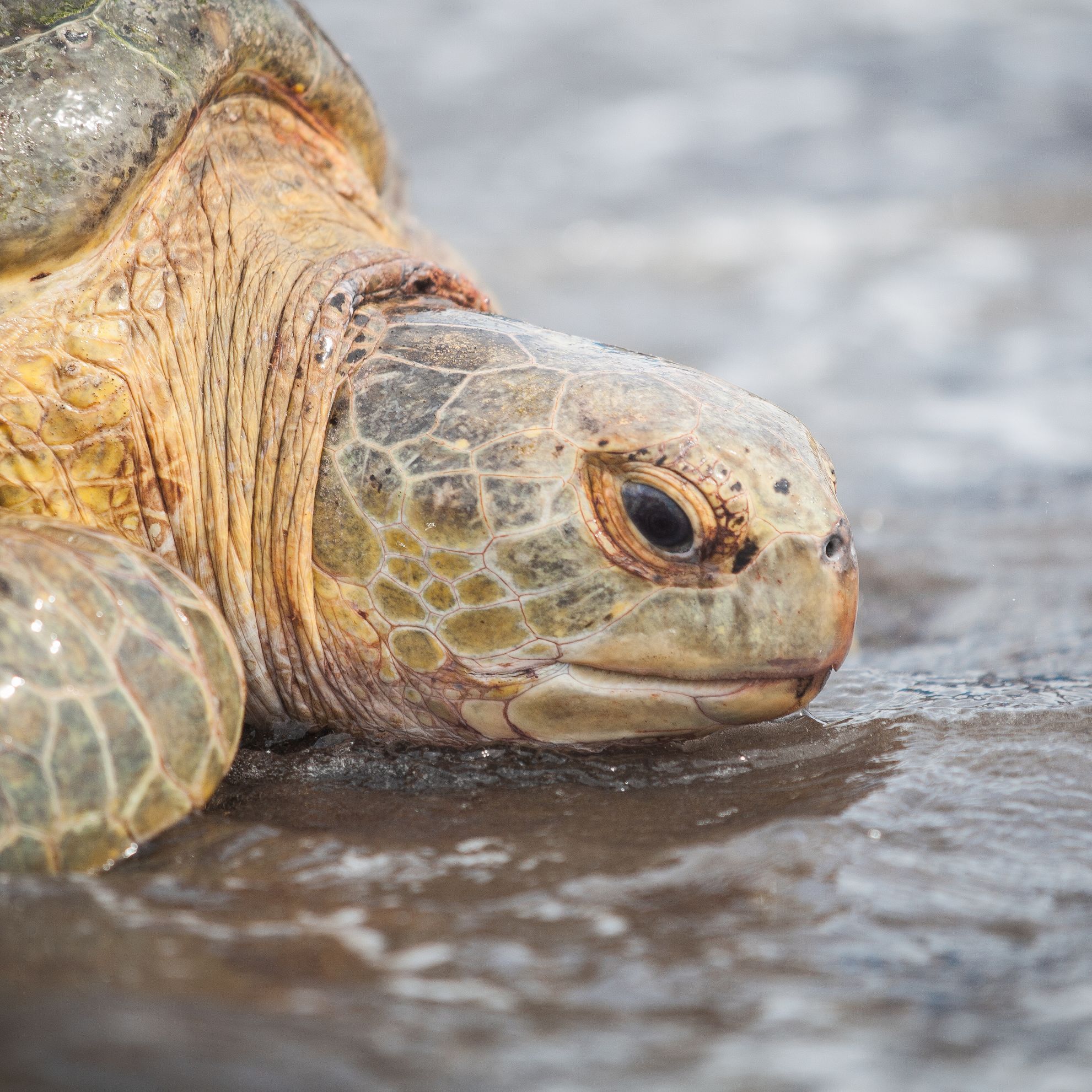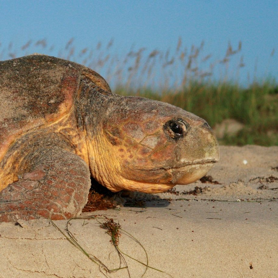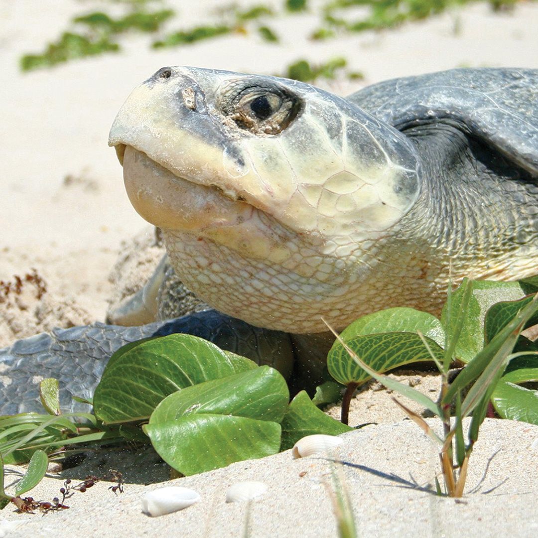 Olive Ridleys are named for their olive green colored shells. They are the most abundant sea turtle in the world and inhabit tropical and subtropical waters of the Pacific, Indian and Atlantic Oceans. Generally found in coastal bays and estuaries, they typically forage off shore in surface waters and use their powerful jaws that allow for an omnivore diet of crustaceans (such as shrimp & crabs), mollusks, tunicates, fish, crabs, and shrimp. They can be very oceanic over some parts of its range and dive to depths of 500 feet (150 m) to feed on bottom dwelling crustaceans. Similar to Kemp’s Ridleys they nest every year in mass synchronized nestings called “arribadas” (Spanish for “arrival”) up to two times each season. An average clutch size is over 110 eggs which require a 52 to 58 day incubation period.