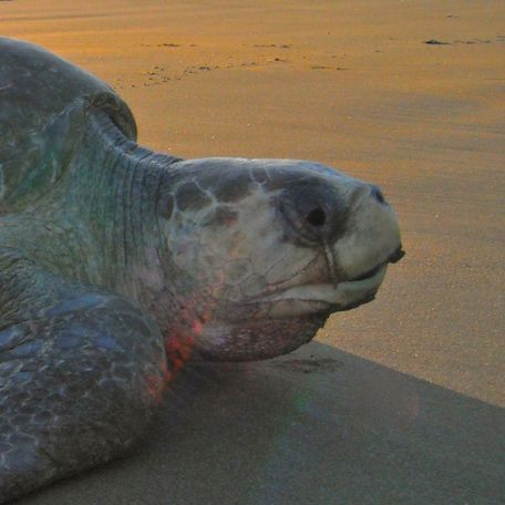 Olive Ridleys adults measure 2 to 2.5 feet (62-70 cm) in carapace length and weigh between 77 and 100 pounds (35-45 kg). Their head is quite small and both the front and rear flippers have one or two visible claws. Their carapace is bony without ridges and has six or more large lateral scutes (scales) and is nearly circular and smooth. Adults are a dark grey green, which is a deeper color than the very similar Kemp’s Ridley sea turtle, while juveniles are charcoal grey in color and hatchlings are black when wet with greenish sides.